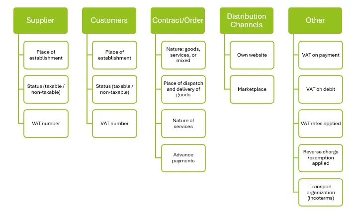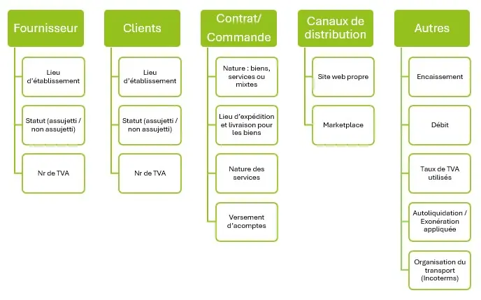 Pour analyser correctement une opération, appliquer le traitement TVA conforme (TVA collectée/ exonérée/autoliquidation etc) et apposer les bonnes mentions sur facture, il faut disposer d’un certain nombre d’informations essentielles (liste non exhaustive) :