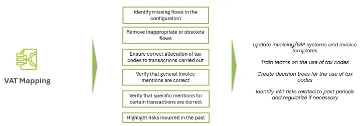 Nous développons ainsi des outils adaptés à votre organisation, tels que des matrices de traitement TVA (ventes et achats), des mappings entre règles métier et paramétrage système, ainsi que des arbres décisionnels permettant de guider les utilisateurs dans leurs choix.
