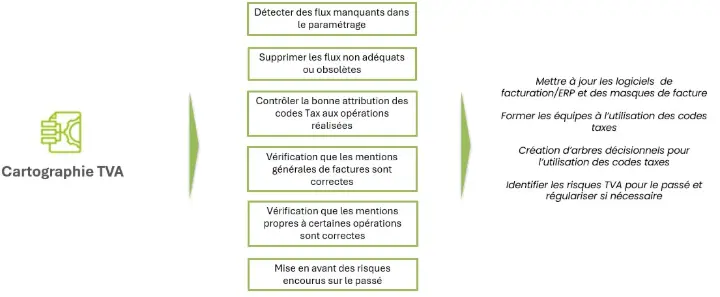 Elle permet d'identifier les flux (biens/services, achats/ventes), d'établir un diagnostic TVA (exonérations, autoliquidation, déduction de la TVA, numéros de TVA à l’étranger, déclarations TVA et ESL, mentions sur factures) et de détecter les éventuelles anomalies.
